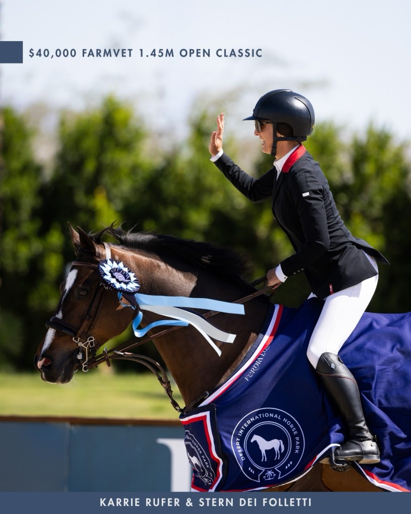 Thermal, California – March 08, 2026 – Karrie Rufer (USA) has had the kind of winter circuit many riders only dream of. On Sunday, March 8, Rufer picked up her seventh headlining victory of the season at Desert International Horse Park (DIHP), further lengthening her front-runner position in the 2026 Desert Circuit Leading Jumper Rider Standings. This time, Rufer’s win came aboard Stern Dei Folletti in the $40,000 FarmVet Open Classic – 1.45m.